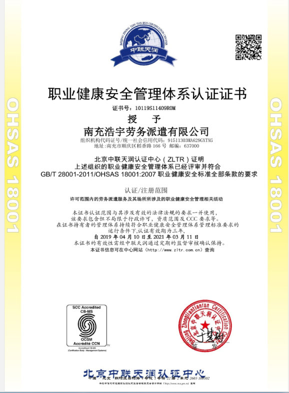 我公司獲得職業(yè)健康安全管理體系認(rèn)證證書